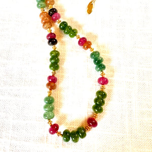 Did you know that the gemstone tourmaline comes in more colors, shades and combos than any other gem? Even more than sapphire! This necklace rocks...many of those colors, ranging from black, blue green and pink. It's highlighted gold-toned accent beads that lighten the weight and separates the colors.