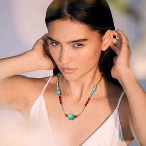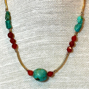 Turquoise, carnelian and gold-plated elements make this a statement boho necklace. A massive 20 x 18 mm turquoise is complimented by carnelian gemstones and gold...tones that all enhance you and your skin tones! Light weight and stunning gemstones rock this necklace, just like you will! This measures 17.5" (44cm) in length, but can be ordered in your favorite size. It's sold separately but the one photo shows the layered look.