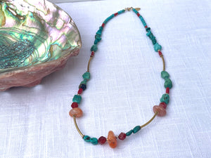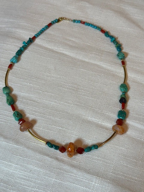 Step into a world of vibrant elegance with our eye-catching boho necklace, meticulously crafted with turquoise, carnelian, coral, and sunstone gems. The golden tubes artfully...space the gemstones apart, creating a lightweight yet stunning accessory. Measuring 20.5" (52 cm) in length, this unique piece can be customized to your preferred size. Perfect for layering, it pairs effortlessly with other turquoise necklaces from our collection. At CaraLux, we pride ourselves on offering handmade, original designs at an affordable price, allowing you to enjoy a bit of luxury every day.