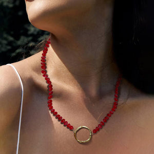 This stunning Hot Pink chalcedony hand-knotted necklace features a gold-plated focal circle and 14k gold-filled findings, epitomizing luxury at an affordable price. With a length...of 19 inches (48 cm), this versatile gemstone treasure can also be customized to your preferred size. As each piece is one of a kind (OOAK), you’re not just wearing jewelry, but a unique work of art from CaraLux. Enhance your collection with this exceptional piece and experience the elegance and craftsmanship of our handmade jewelry.